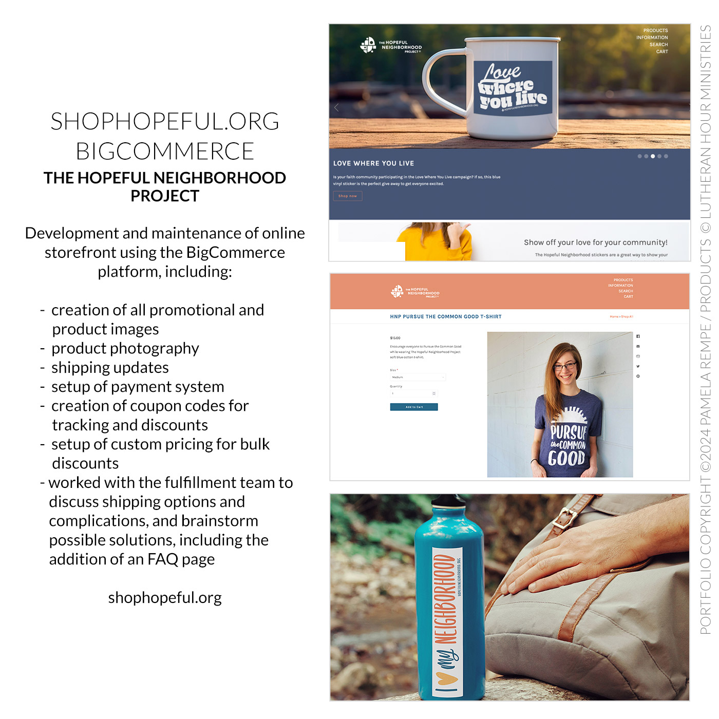Manage the design, setup, products, accounts, and reports for an online storefront using the BigCommerce platform. Check out the store at shoplhm.org.